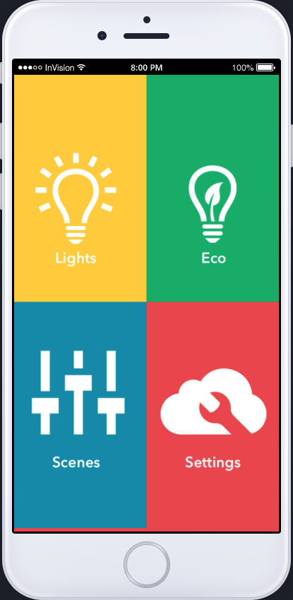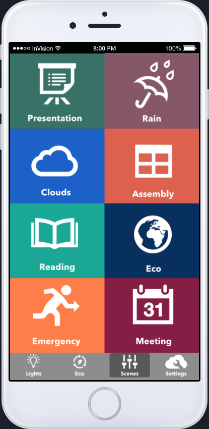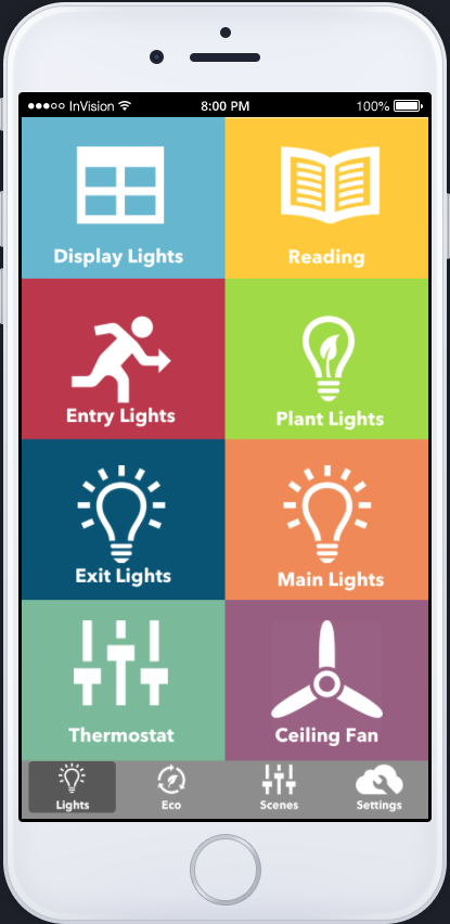 Groups of lights are displayed in a scrolling list of large, highly visible buttons