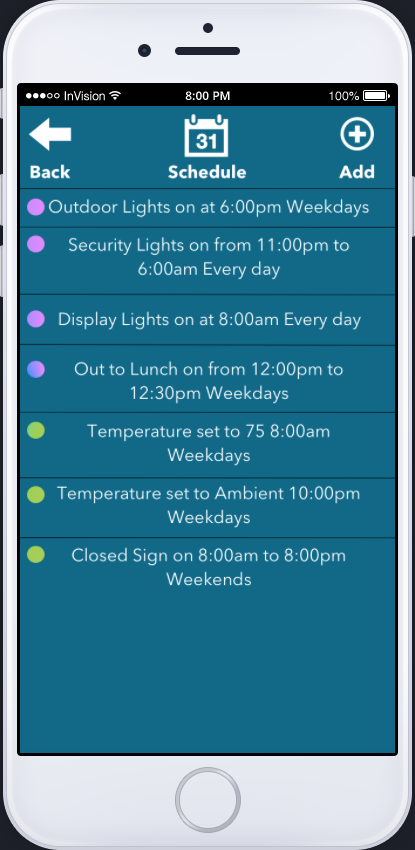 intelliSSL Mobile™ for iOS and Andriod brings user and administrator access to the wireless lighting system. In addition to point, group, and scene settings there are event actions and timed actions that can be scheduled. The intelliSSL Mobile Apps are template-driven for commercial businesses to accommodate their typical business activities, setup and operations. Initial staging of a wireless lighting system is simplified through configuration prompts during App setup, requiring no programing.